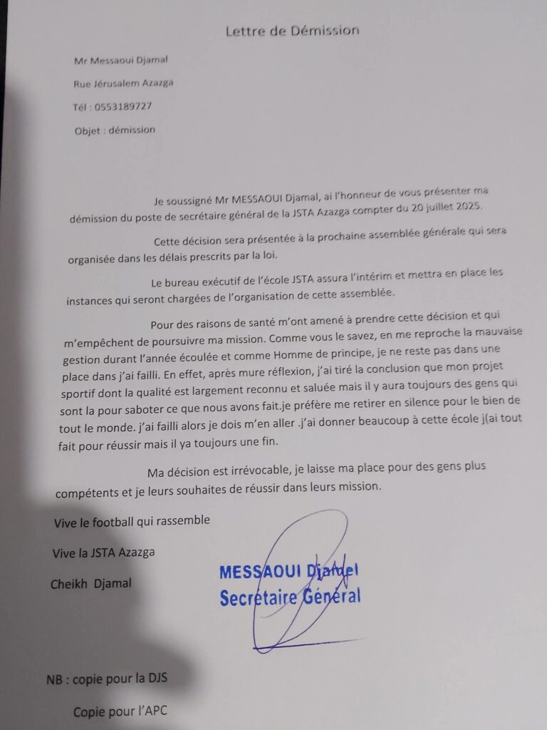 Il est vrai que dans le document dont Sport24 détient une copie, il a motivé cette démission pour des raisons de santé. Néanmoins, il est revenu tout de même sur ce qui lui est reproché à savoir “une mauvaise gestion”. Il écrit, en outre, que même si son projet sportif est grandiose et qu’il est reconnu par tous, il y a des personnes qui voudraient le saboter et si bien qu’il a préféré partir en silence pour le bien de tous et laisser sa  place pour ceux qui gèreront mieux cette école”. Et c’est ainsi que Djamel Messaoudi met fin à sa fonction au sein de cette grande école de football de la JST Azazga. Il conclut son écrit en insistant que sa « décision est irrévocable ». Qui succédera à Djamel Messaoui ?
